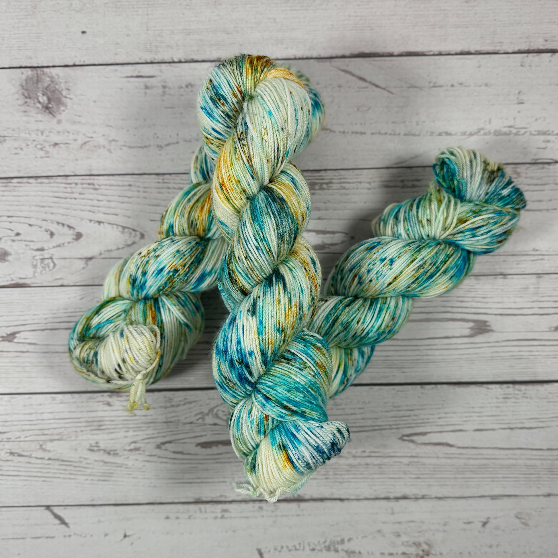 From dice dye episode 35 on my instagram. A heavily speckled yarn that brought together colors you would find at a creek. When I originally dyed it up it was on fiber and the colors spread and mixed together in a very pretty way.
