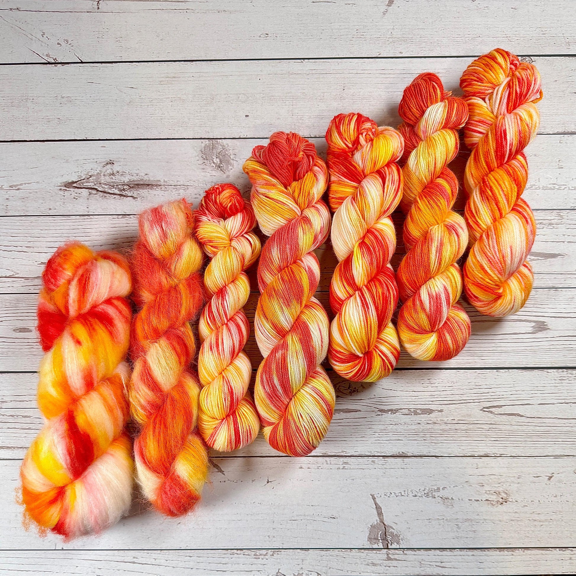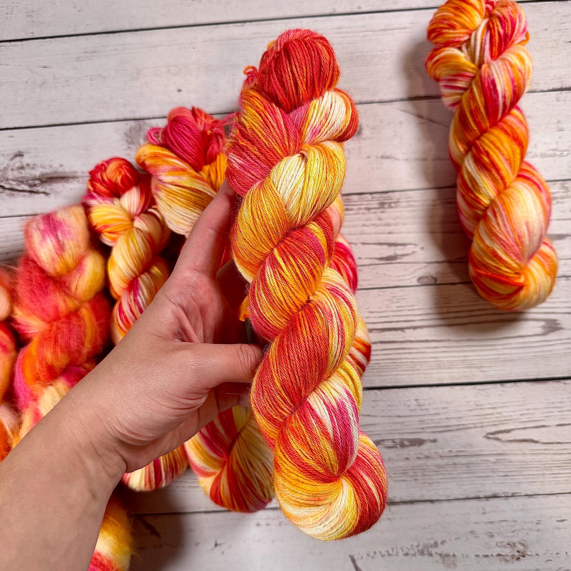 Meet Feels like Summer the color that started this whole collection. I was playing around with leftover dye when I made a colorway that made dropped everything and want to create a color that represented the bright intense colors of summer. I feel like I accomplished that with this colorway. Feels like Summer is a twist variegated layering pink, yellow and orange.