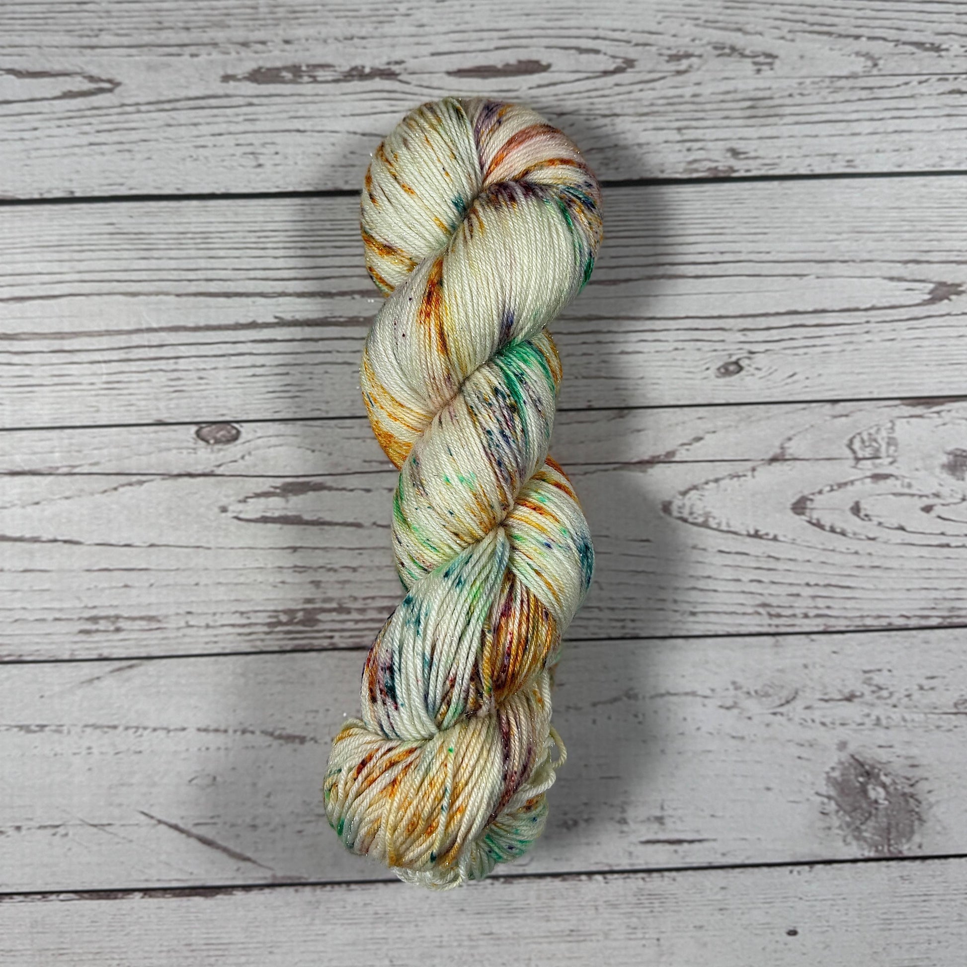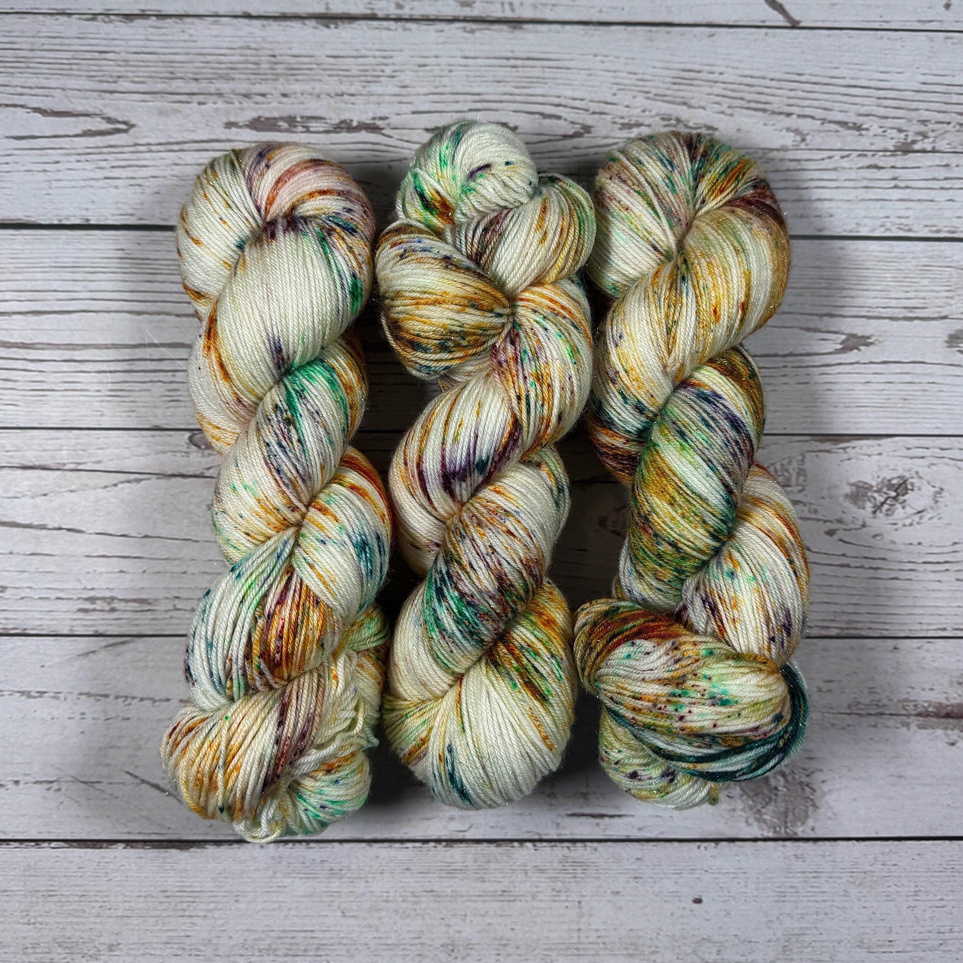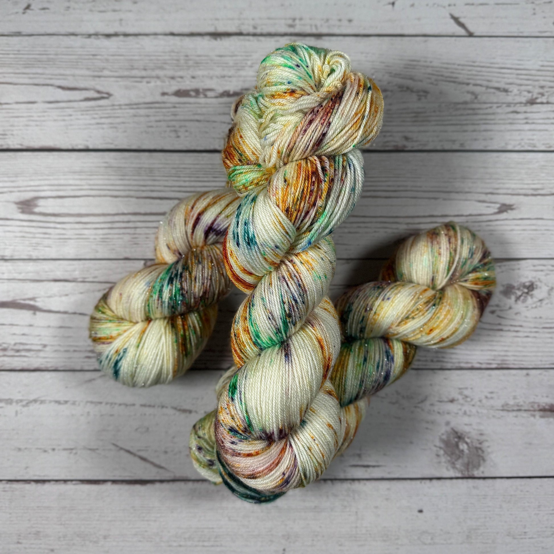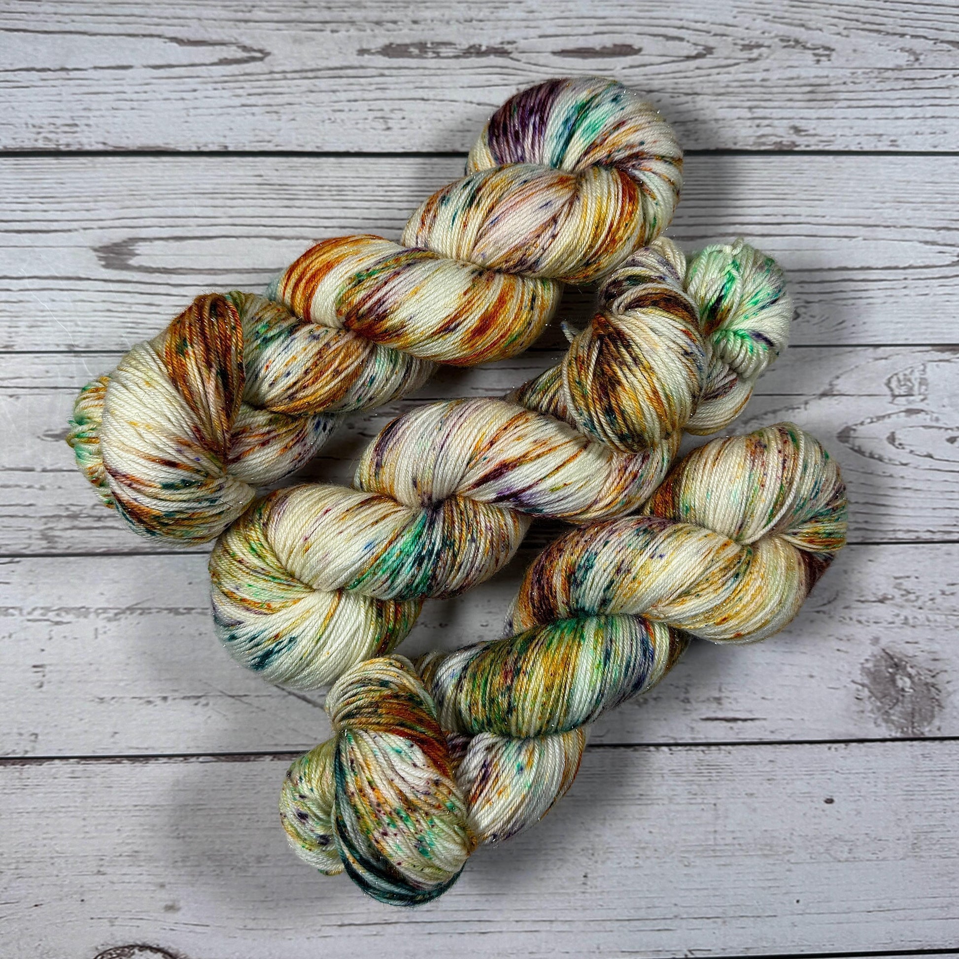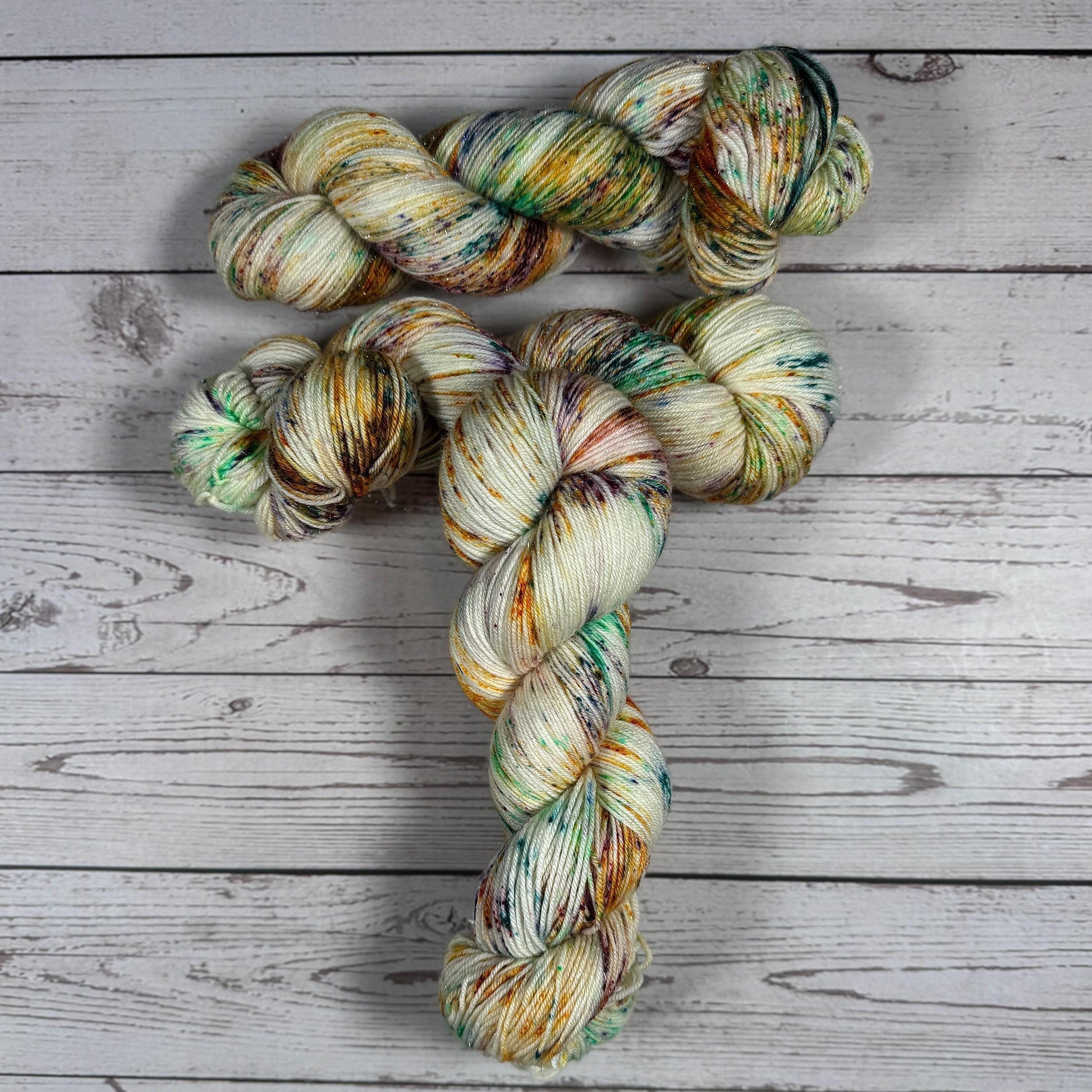 From dice dye episode 38 on my instagram. A colorway with halloween as the theme. Heavily speckled with colors associated with halloween.