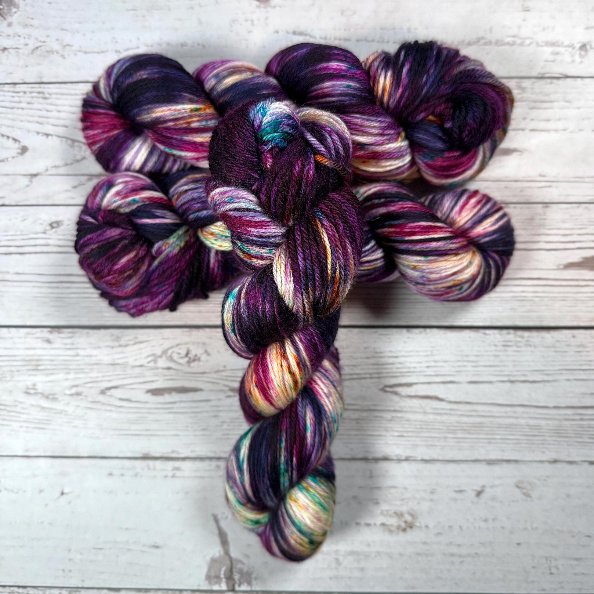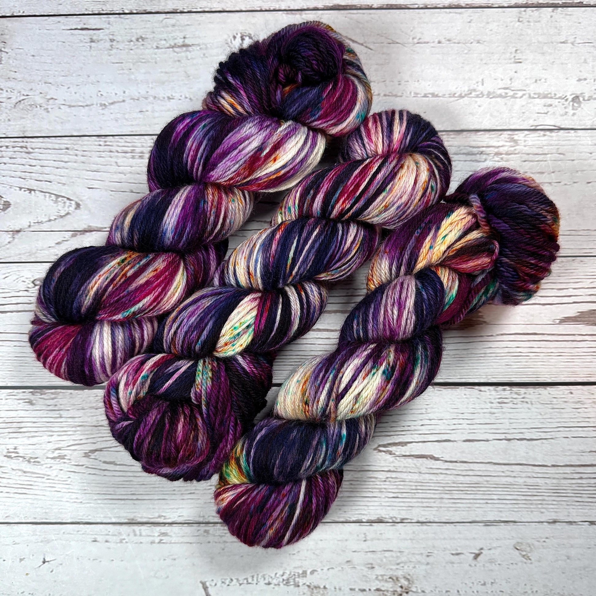 From dice dye episode 20 on my instagram. A dark and moody fall vibe skein that a follower so nicely named Redwood Witch. At first I wasn't a fan of the orange speckles in this skein but I think they add some depth to the color palette.