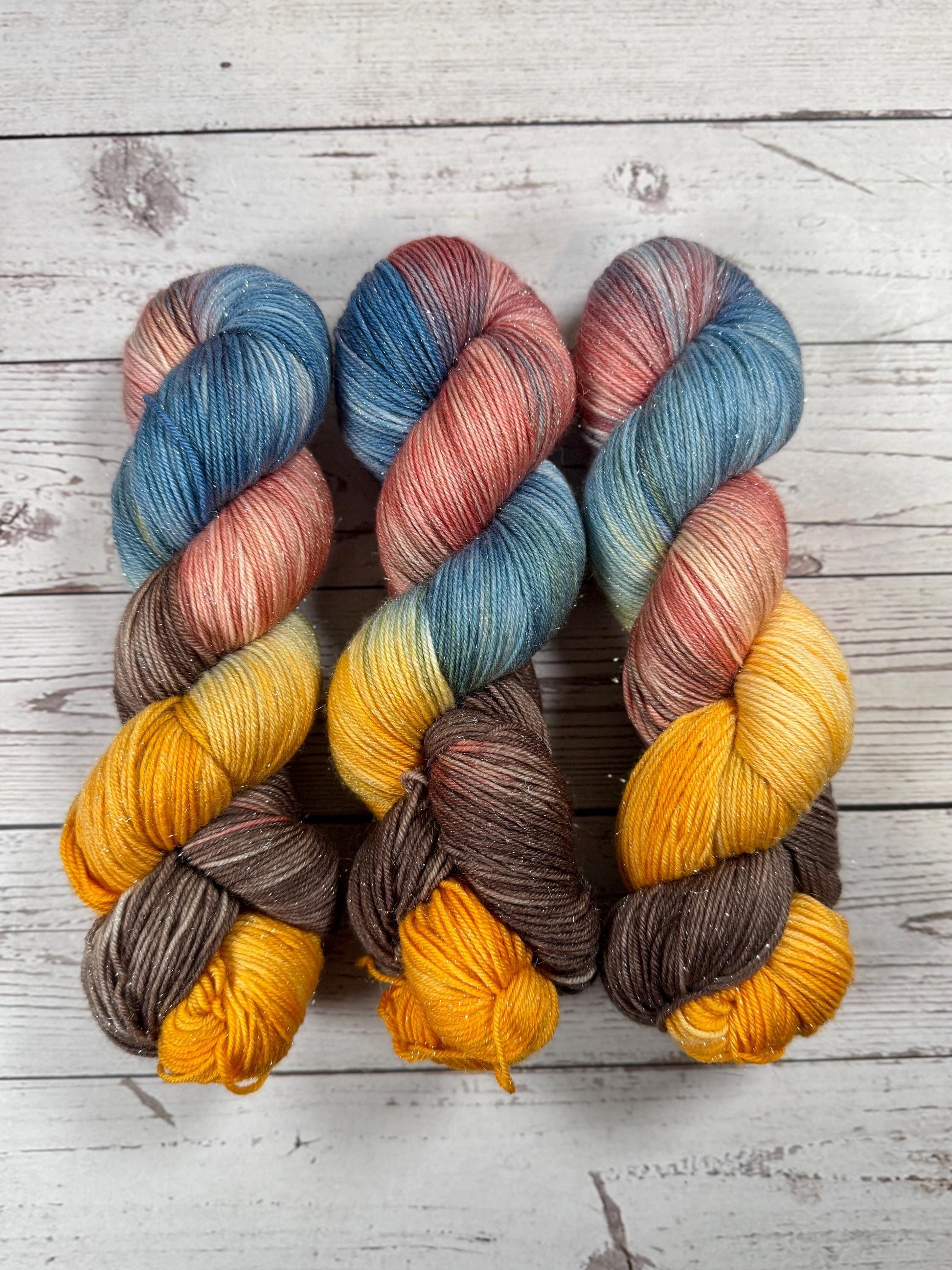 From dice dye episode 8. A simple 4 color yarn with blue, yellow, pink and brown.